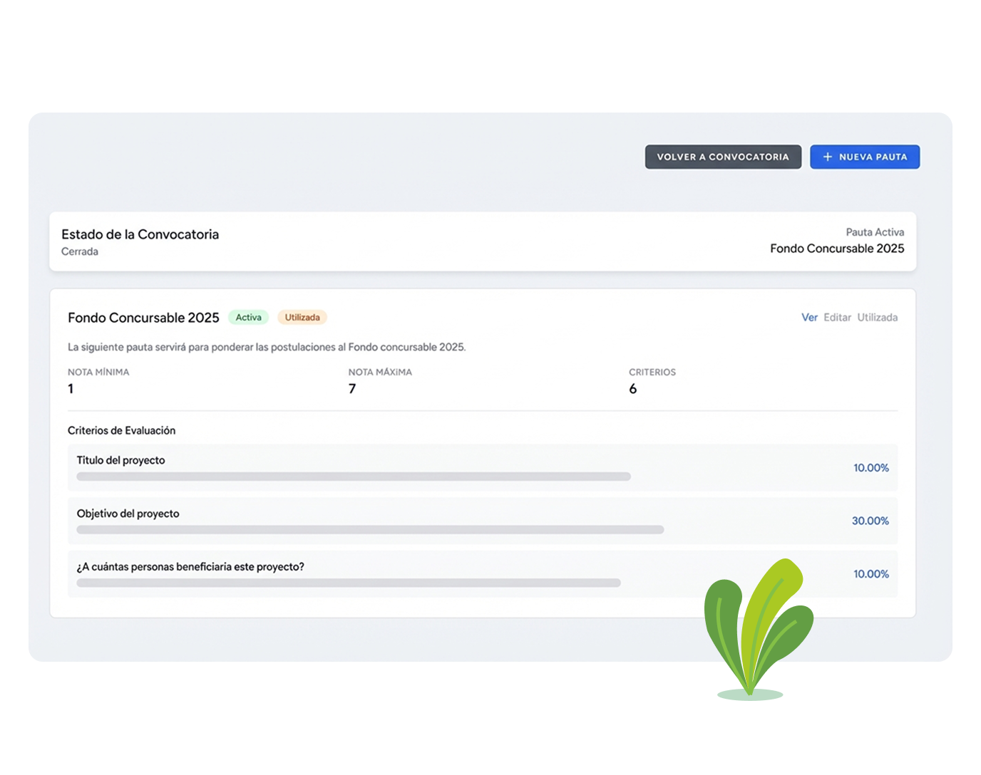 Soporta cualquier tipo de convocatoria — de una sola etapa, multi-etapas, votación pública y más.